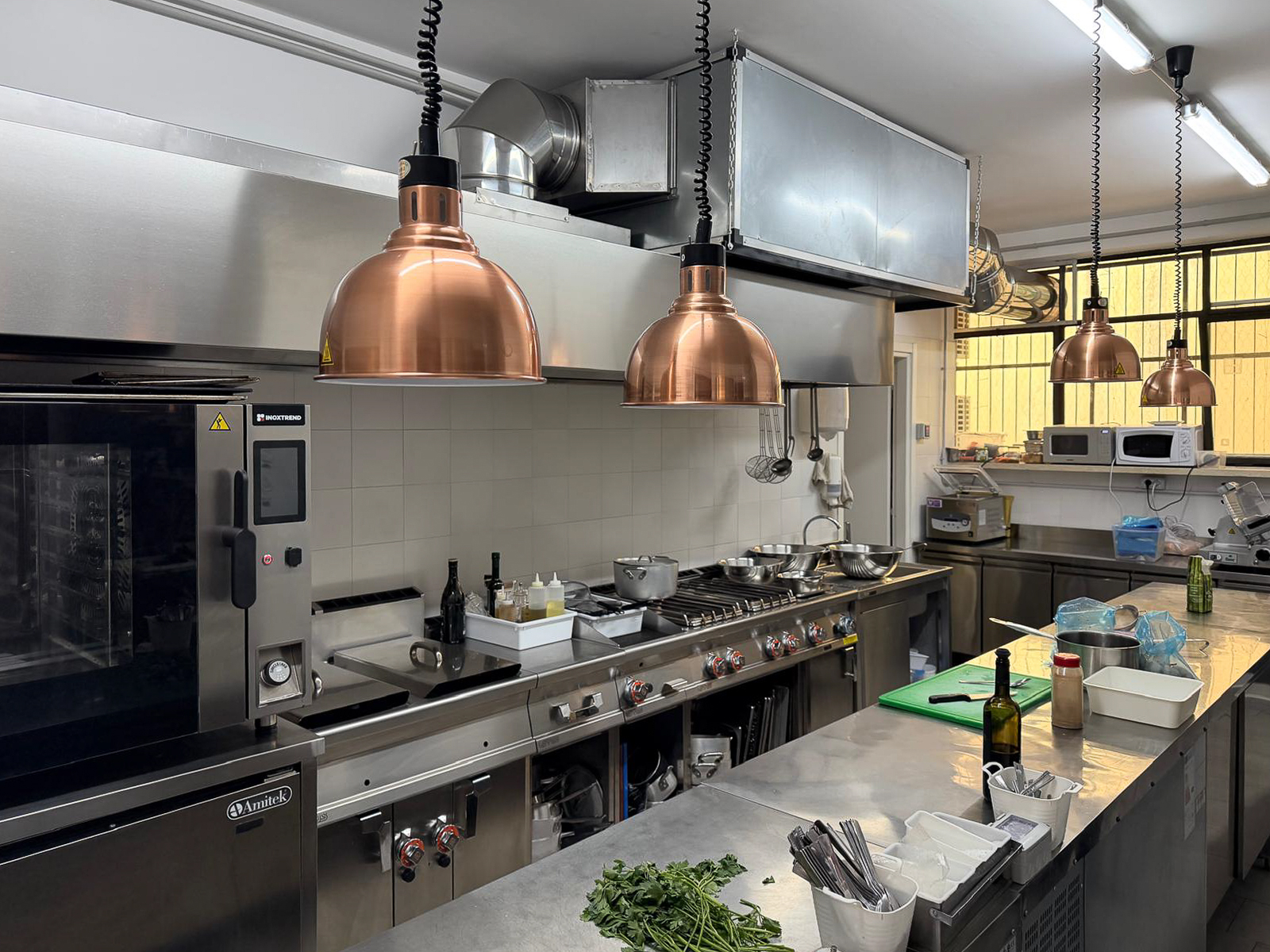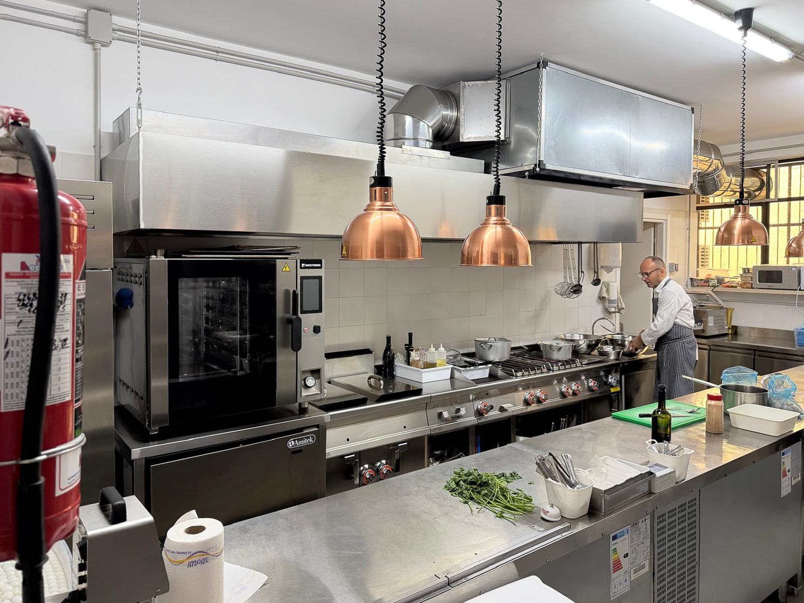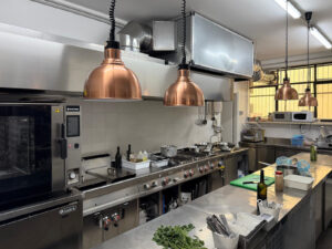 Cucina di ampie dimensioni, completamente attrezzata con doppio congelatore, abbattitore, forno a gas Inoxtrend, frigorifero, due microonde, macchina per lavaggio piatti e stoviglie e vari banchi di appoggio con parte sottostante refrigerata. Nella parte sottostante è presente un locale magazzino con spogliatoi personale di circa 60 mq. Nella zona bancone è presente una cocktail station attrezzata con macchina del ghiaccio per aperitivi e serate. Il bancone della sala è attrezzato con banco caldo e freddo.